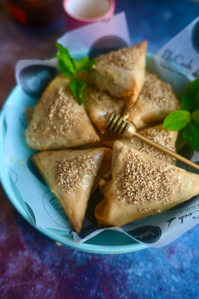 7. Place the triangles on a baking tray, add a bit of butter and sesame seeds, and bake for 20-25 minutes or until golden and crispy.