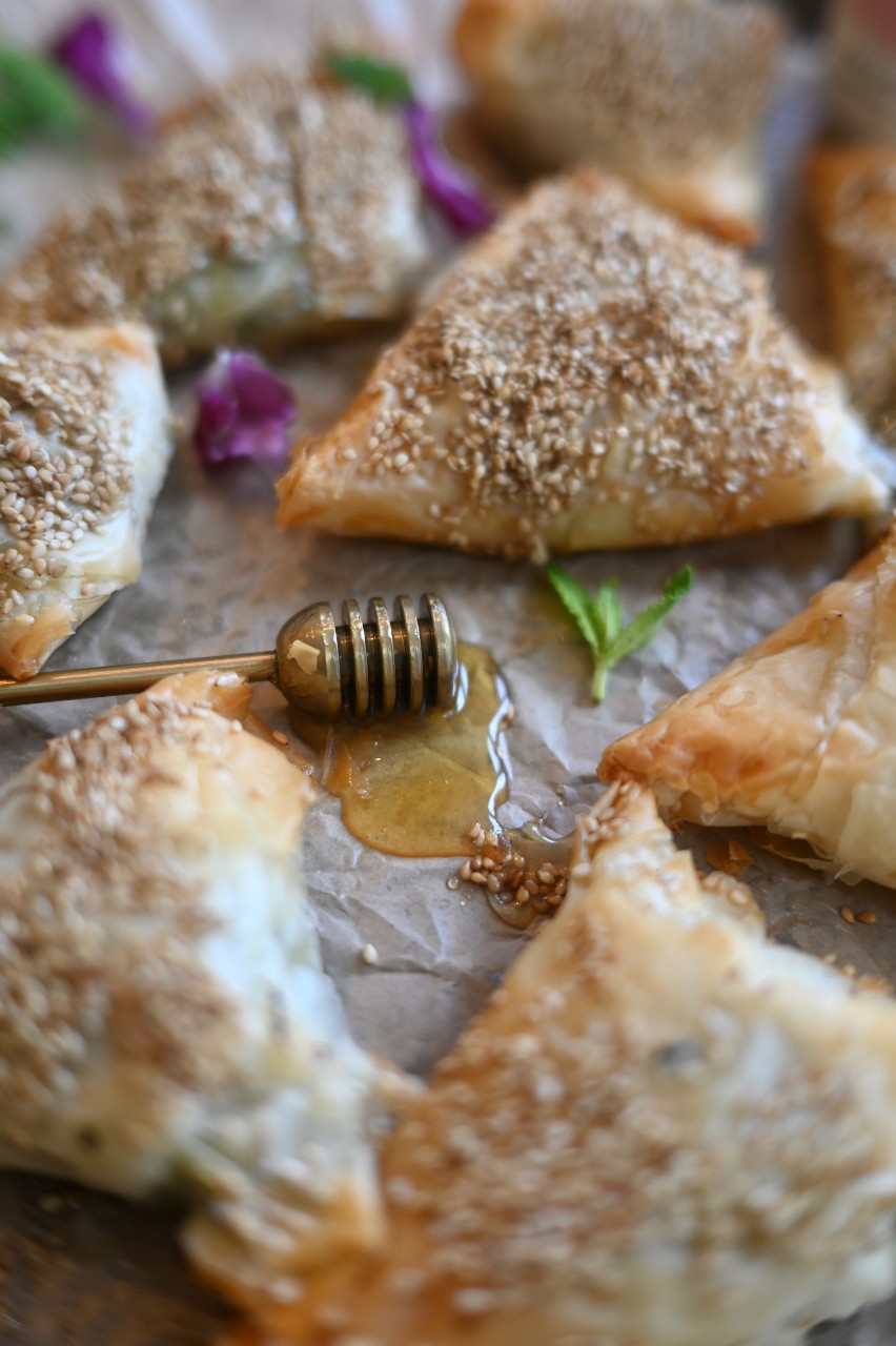 8. Serve the Spanakopita triangles hot with a drizzle of honey. Enjoy this delicious Greek recipe!