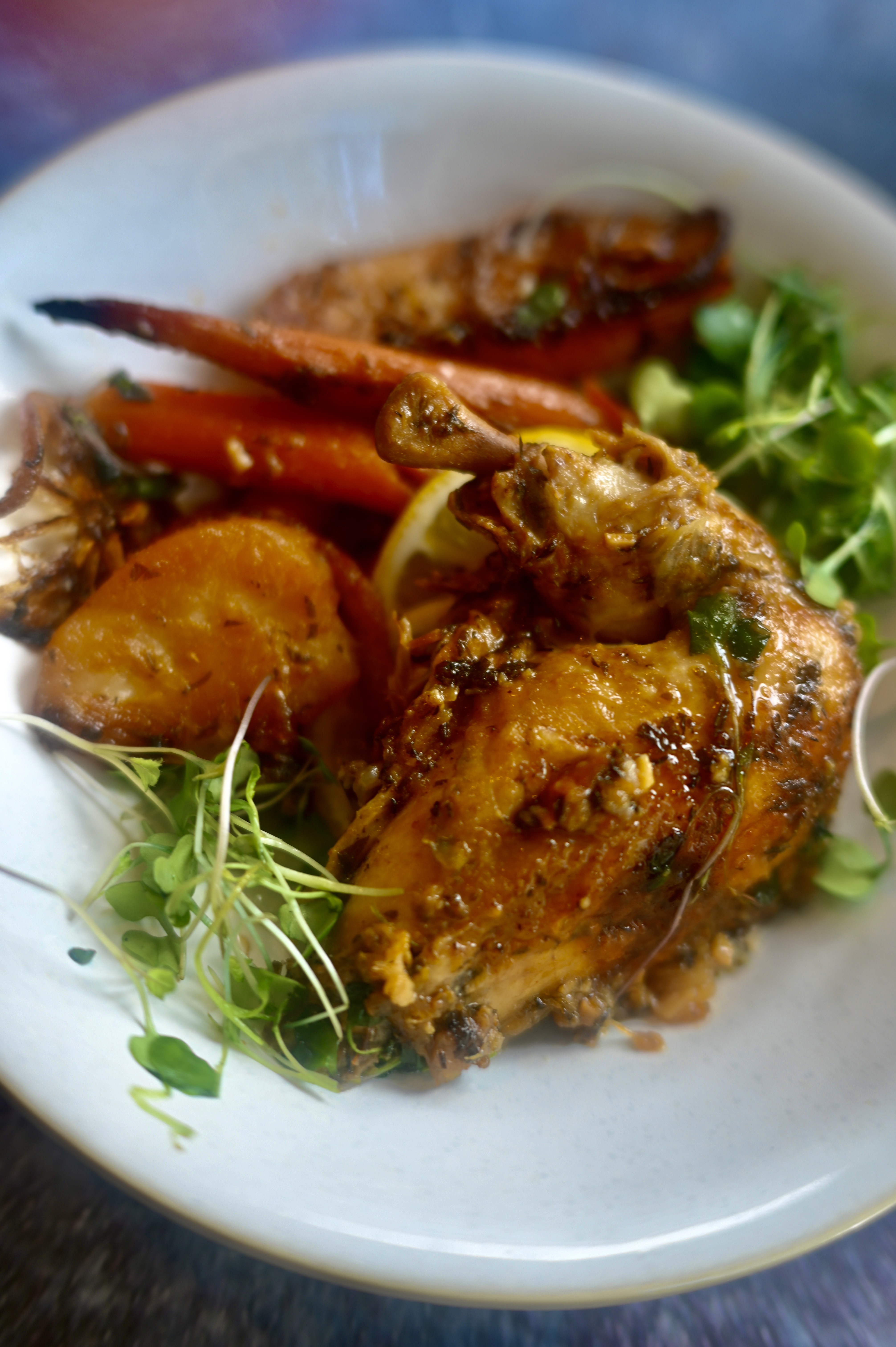 4. Pour the olive oil mixture over the chicken, turning the pieces to cover all sides. (You can marinate the chicken in this mixture if desired, for about half an hour.) Place lemon and orange slices, potatoes, carrots, and onion around and under the chicken. Sprinkle generously with thyme, rosemary, salt, and pepper.