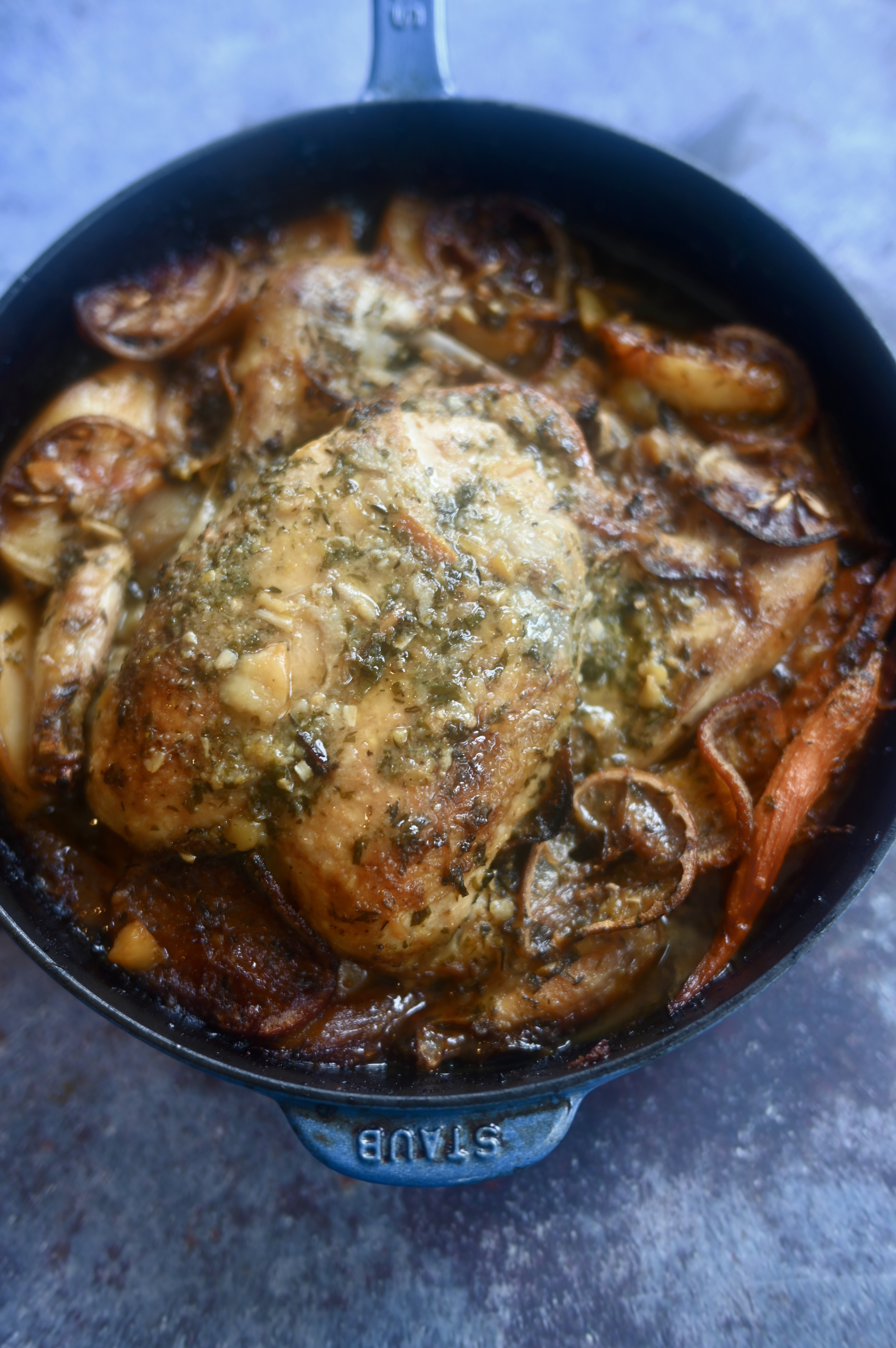 5. Bake uncovered for about 1 hour or until the chicken is cooked, and the juices run clear. Transfer the pieces to a serving dish and garnish with additional fresh chopped herbs, if desired.